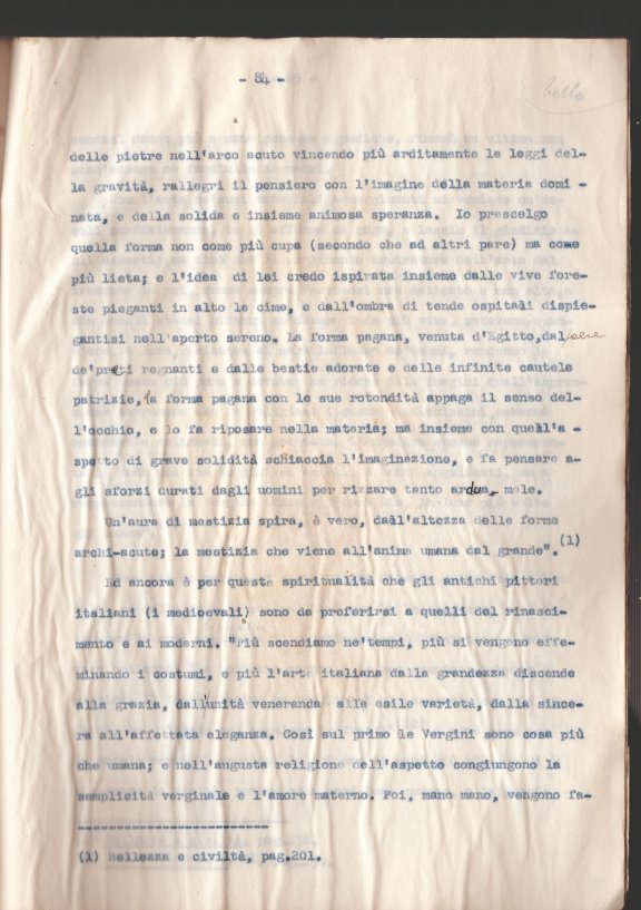 Descrizione: Tesi dattiloscritta (90 c. ; 31 cm.). Discussa presso la Facoltà di lettere e filosofia dell’Università degli studi di Firenze. Data della discussione 23 giugno 1932 (Archivio storico dell'Università di Firenze, registro delle tesi laurea). Laura Luzzatto Coen (Trieste 1911 - Firenze 1995) lavorò alcuni anni come bibliotecaria nella Biblioteca Nazionale di Firenze, da dove fu licenziata nel 1939 in seguito all'applicazione delle leggi razziali. Tradusse dal tedesco diverse opere, anche di argomento musicale, per importanti case editrici (Mondadori, Il Saggiatore, La Nuova Italia), firmandosi spesso con il cognome del marito, Luigi Dallapiccola, sposato nel 1938.